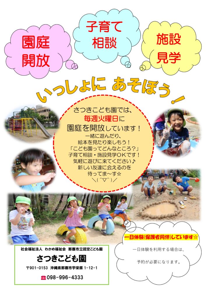 園からのお便り ☆★子育て応援デー★☆ 2025.10.01 97 当園では、地域住民の皆さんに対する子育て支援の一環として、園庭の開放や保育体験等を行っております。 ○実施日:毎週火曜日(祝祭日は除く) ○時間:9時半~11時 ご利用の際は、事前に園の方までご連絡をお願いします。 📞(098)996-4333 担当:内間 投稿者 さつきこども園 職員 / さつきこども園